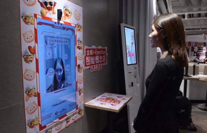 Le groupe Yum (propriétaire de KFC ou encore Pizza Hut en Chine) s’est associé avec Alipay (système de paiement mobile du géant e-commerce chinois Alibaba). Ensemble, ils ont conçu une technologie permettant de payer via la reconnaissance faciale. Concrètement, le terminal de commande compare les visages des clients avec la photo présente sur leurs comptes Alipay pour valider le paiement. Plus de 600 informations faciales sont analysées. Le logiciel utilise une caméra 3D afin de s’assurer que les utilisateurs ne tentent pas d’usurper un compte avec une simple photographie.